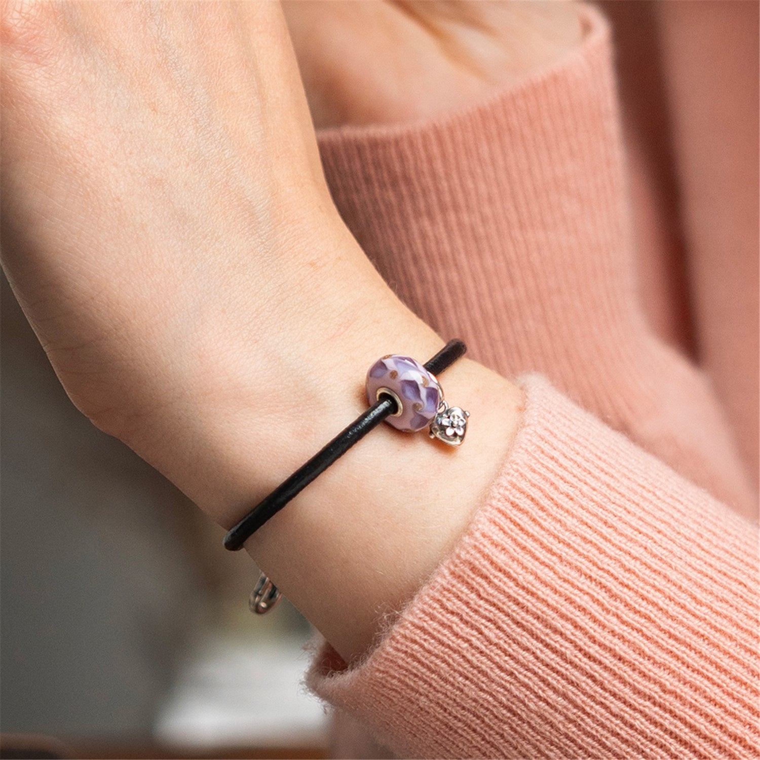 The leather bracelet is embellished with the Limited Edition Romance Touch glass bead, a small masterpiece with soft purple and lavender hues, as well as delicate golden glitter. Next to it hangs the charming Heart’s Blossom Tassel, a sterling silver heart adorned with a lovely flower.