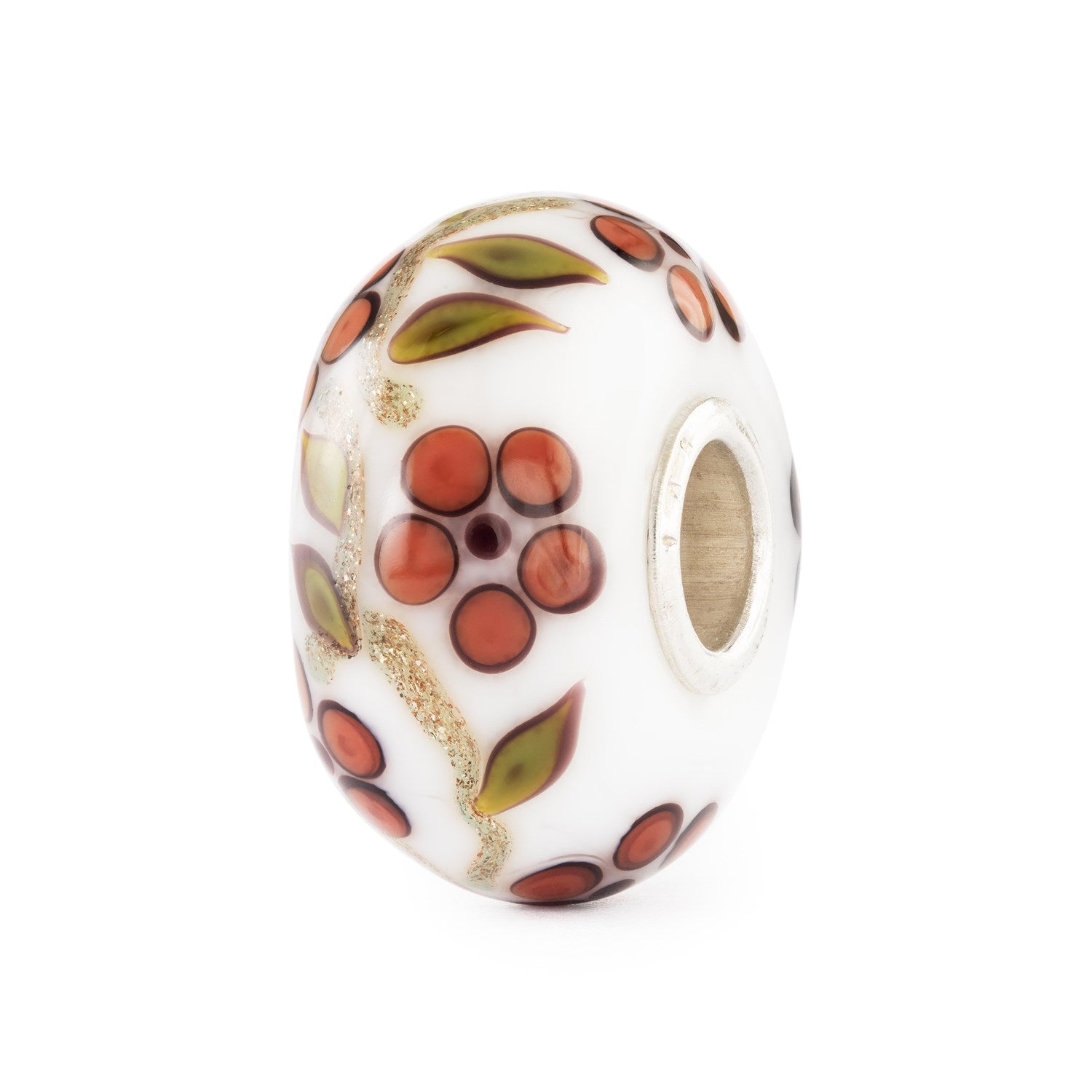 This glass bead has a classic shape and smooth surface, presenting incredible details. Red-brown flowers and green leaves grow from a glittery golden stem on a milky-white surface. The bead has a clean and simple look, yet at the same time, being incredibly detailed. A sterling silver core adds a refined finish, making it as enduring as it is radiant.