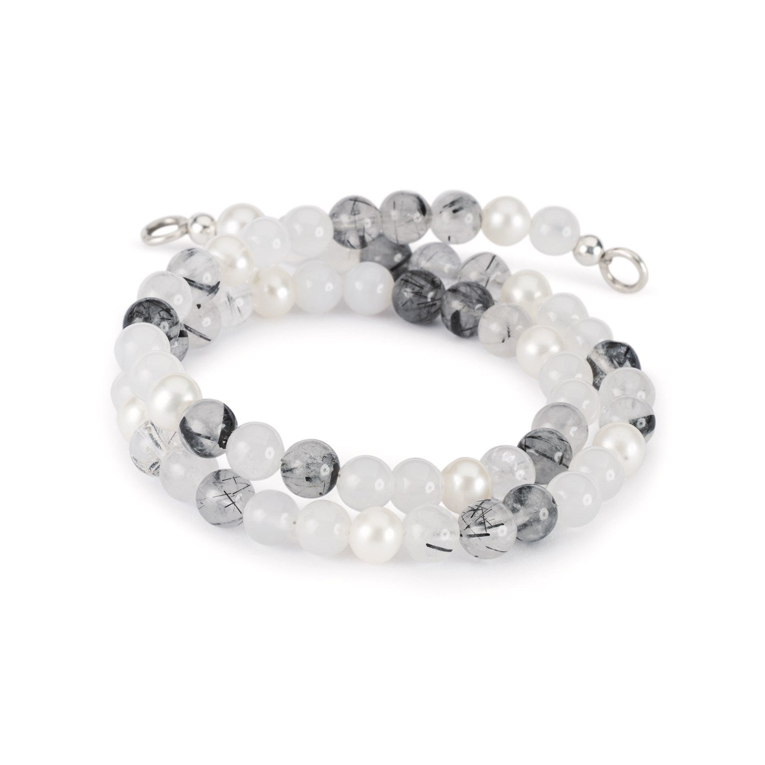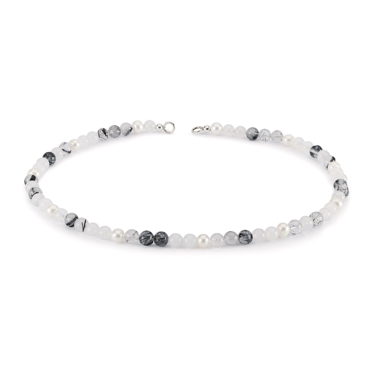 Handcrafted gemstone necklace with Black Rutile Quartz, White Onyx and Freshwater Pearls.