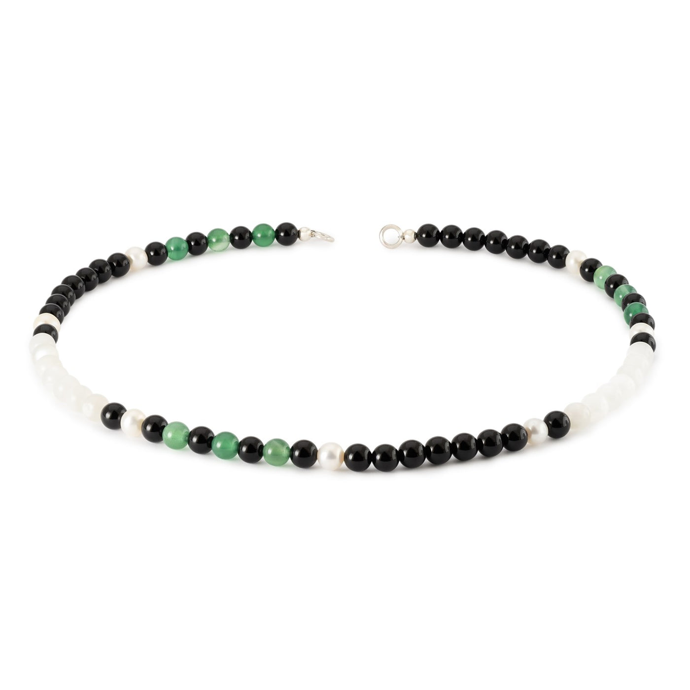 Elevate your style with this necklace, where elegance meets natural serenity. Crafted with a thoughtfully mix of Black Onyx, White Moonstone, Green Onyx, and luminous White Freshwater Pearls. The design is a celebration of contrast and harmony.