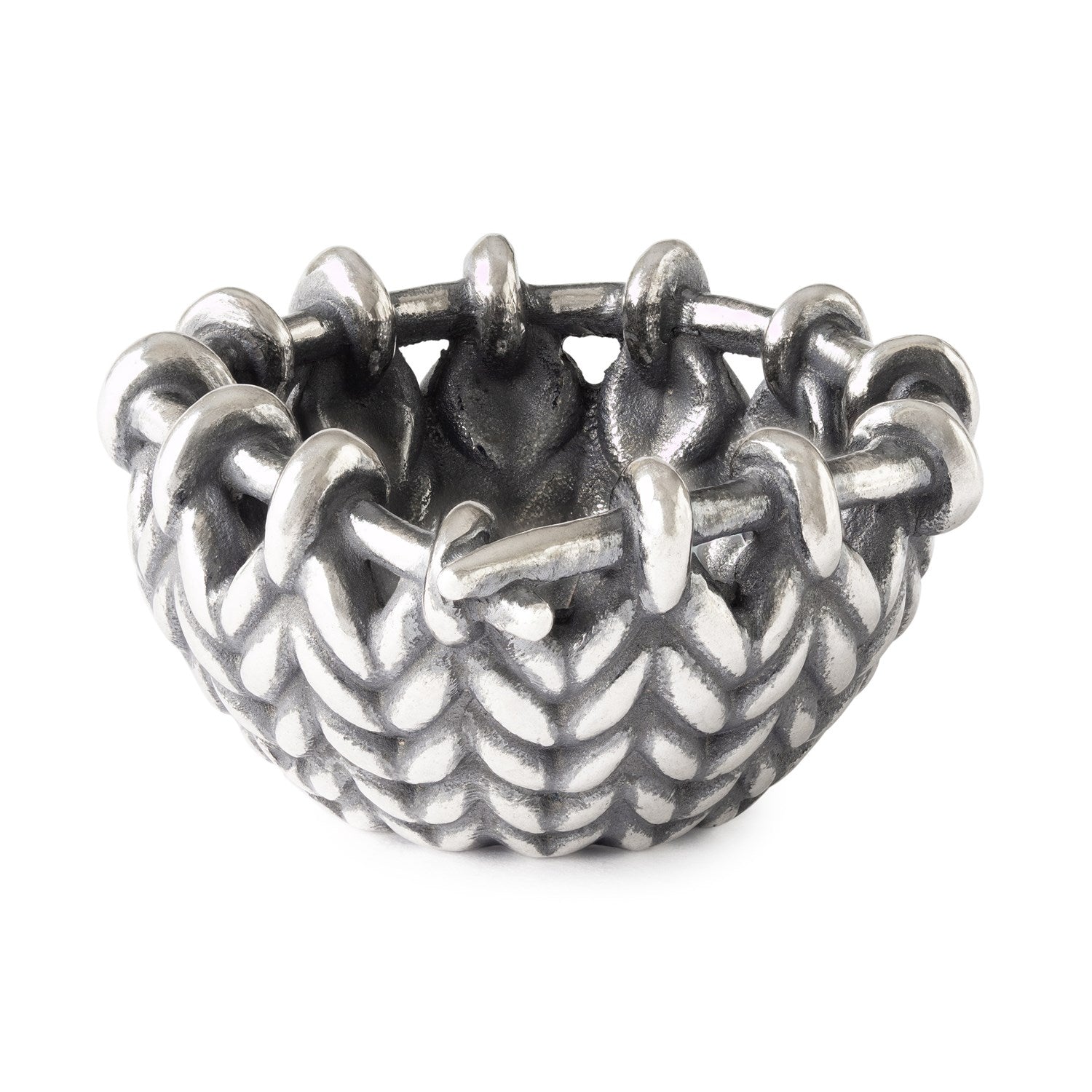 A tiny silver bead that resembles a snippet of knitting frozen in time — each loop delicately spun. It’s a whimsical nod to handmade warmth, where silver mimics the softness of yarn, loop by loop.