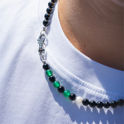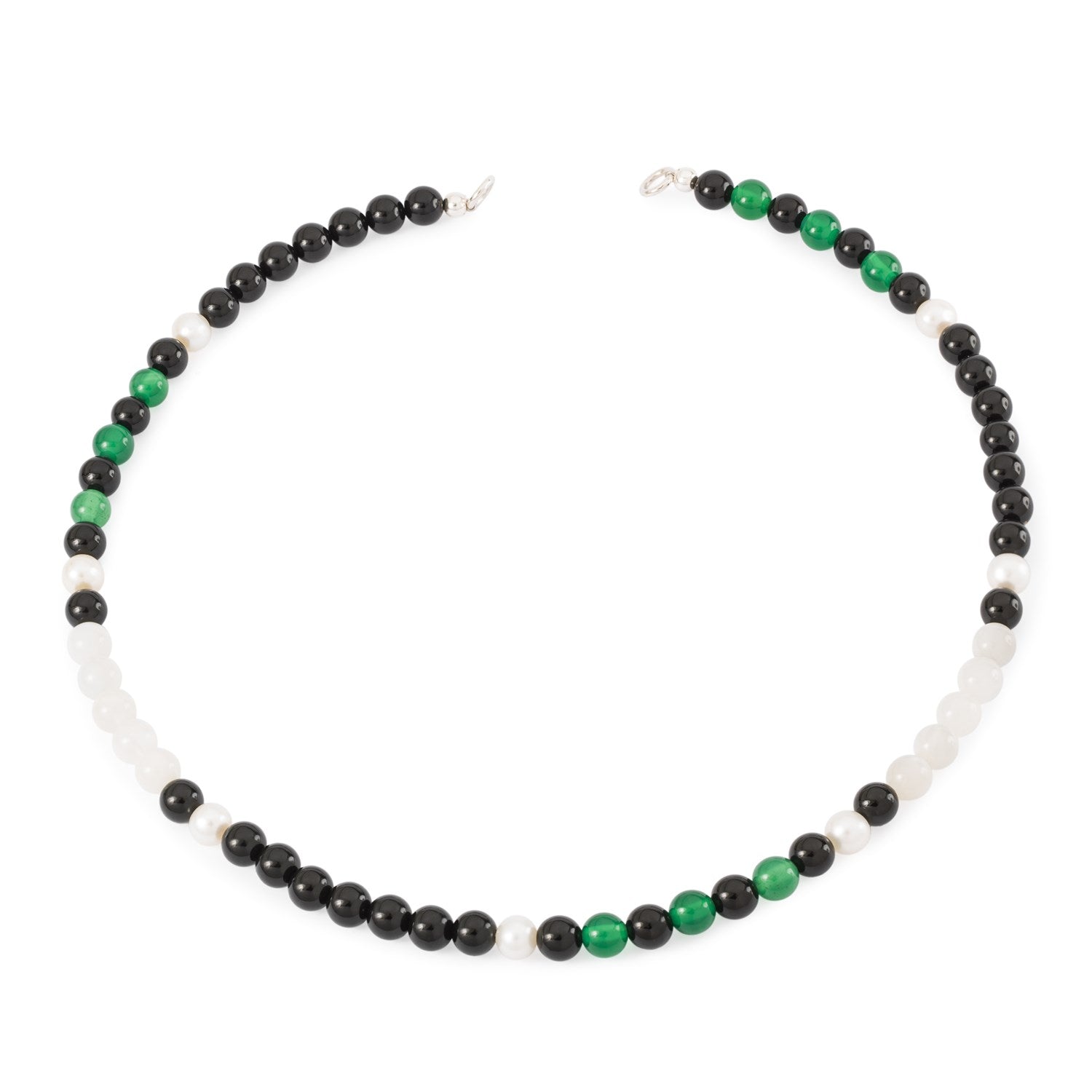 Elevate your style with this necklace, where elegance meets natural serenity. Crafted with a thoughtfully mix of Black Onyx, White Moonstone, Green Onyx, and luminous White Freshwater Pearls. The design is a celebration of contrast and harmony.