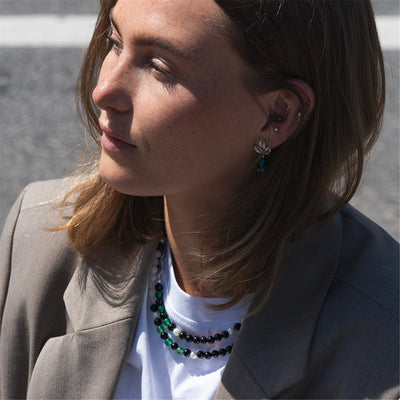 A handcrafted gemstone necklace with Black Onyx, White Moonstone, Green Onyx and White Freshwater Pearls. Together they bring strength, serenity, and timeless beauty to accompany you through life's journey.