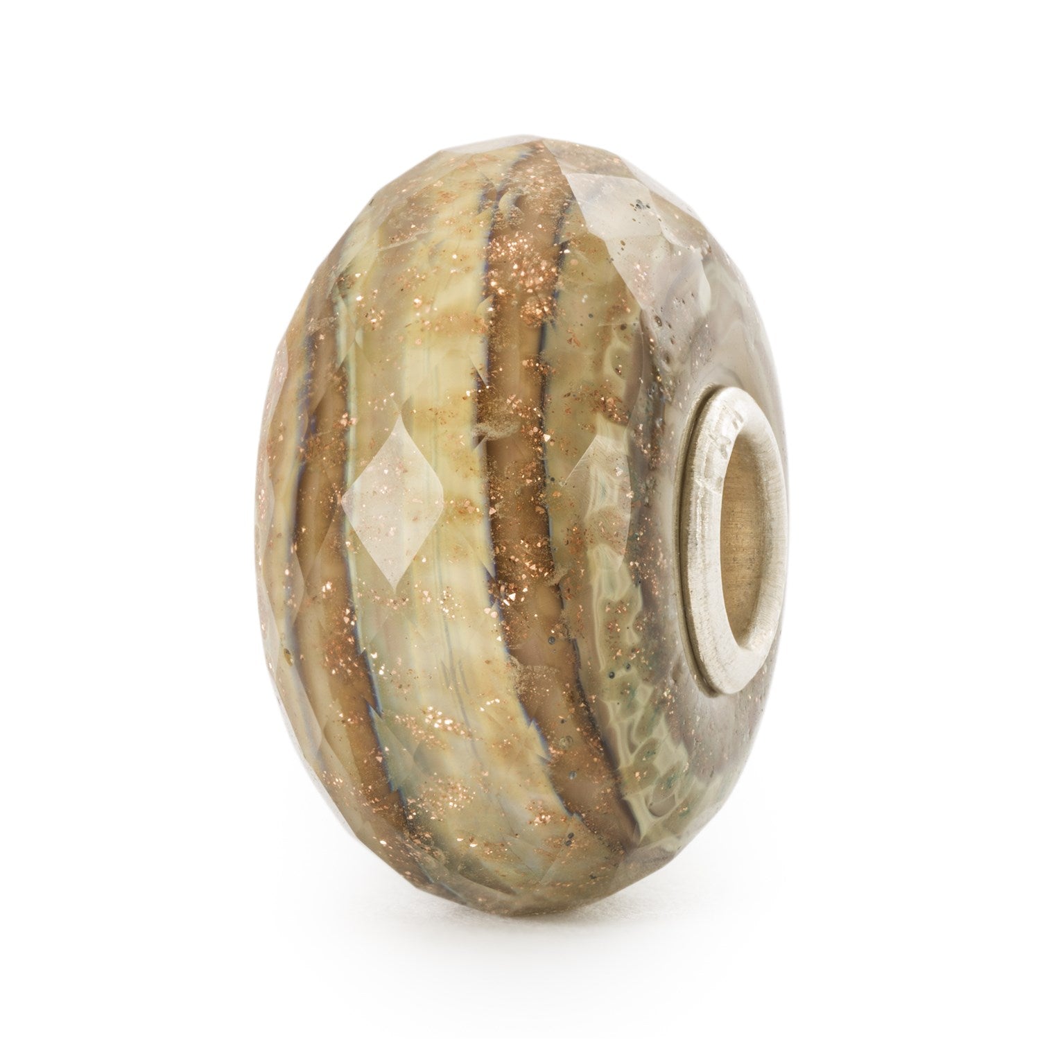 This facetted glass bead features rings of caramel colors from dulche de leche to butterstock. As the light hits, glitter and hints of blue seem to appear.